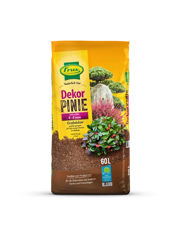 Durch ihre intensive Farbe und ihre Körnung hebt sich die Pinienrinde deutlich vom Grün der Blätter und den Blütenfarben ab und bringt diese dadurch stärker zur Geltung. Sie bildet einen reizvollen Kontrast zu Rasenflächen und Grünanlagen. Gräbern verleiht sie, insbesondere in der feinsten Körnung als Grabdekor, ein würdevolles Aussehen. Der Ziereffekt wird zusätzlich noch durch den angenehmen Duft dieser Pinienart unterstrichen. Die Pinienrinde verhindert das Auflaufen von Unkräutern, wirkt isolierend und schützt den Boden vor Frost und Hitze. Sie vermindert die Wasserverdunstung aus dem Boden, wodurch er frisch und feucht gehalten wird. Die Bodenstruktur bleibt erhalten und Verschlämmungen durch starke Regenfälle werden vermieden. Langanhaltender Dekoreffekt.