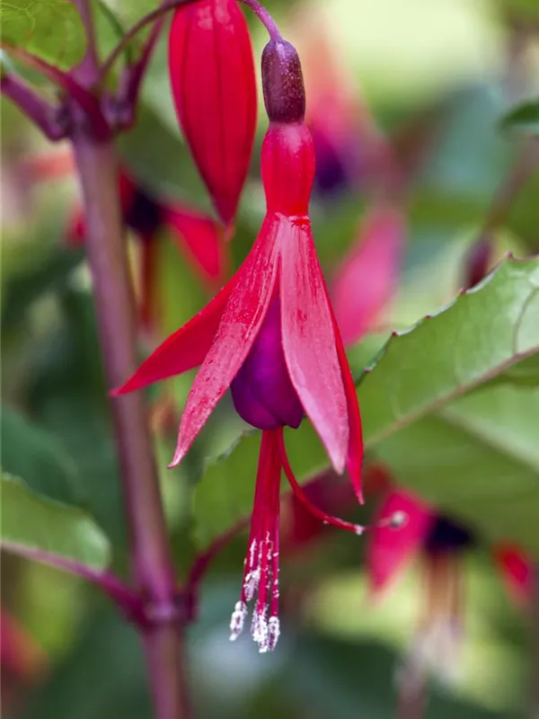 Diese vielblütige, sommergrüne Staude trägt auffällig gestaltete Blüten an ihren überhängenden Trieben. Lange Staubblätter und eine intensivgefärbte, glockenförmige Krone bestimmen den Charme dieser Blütenpracht. Das Laub zeigt sich hingegen kleinblättrig und zeichnet sich meist durch einen gesägten Rand aus. Als pflegeleichter Blickfang wird die Patagonische Fuchsie, die zu den Nachtschattengewächsen zählt, beispielsweise als Kübelpflanze verwendet.