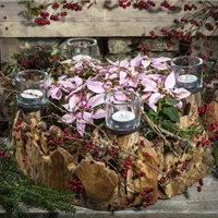 Ganz von allein stellen sich weihnachtliche Gefühle ein, sobald Mutter Natur für Schnee sorgt. Weiße Häubchen auf grünem Untergrund erzeugen heimelige Stimmung. Wenn dann noch rote Farbtupfer aus dem Gebilde hervorlugen, wird es dem Betrachter auch bei Minustemperaturen warm ums Herz. Wunderbar dafür geeignet ist die Scheinbeere, die das ganze Jahr über als immergrüner Bodendecker gute Dienste leistet. Pünktlich zum November sorgt sie für perlenartige Beeren. Davon kann man sich zwei, drei Zweige in eine Vase stellen, vielleicht mit einer Schale daneben, in der die Ernte des Nussbaums liegt. Haben Sie auch einen Winterapfel im Garten? Dann ist Ihr Arrangement ja perfekt!