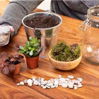 Ein Mal gegossen ist so ein kleines Biotop im Glas ein richtiger Selbstläufer. Und in diesem kleinen Biotop lassen sich viele schöne Pflanzen halten. Dafür benötigt man lediglich ein Bügelglas, Kies, Pflanzen, Erde und Dekoelemente.